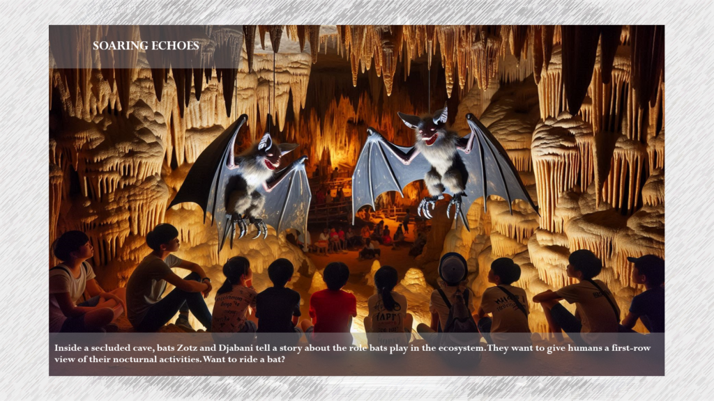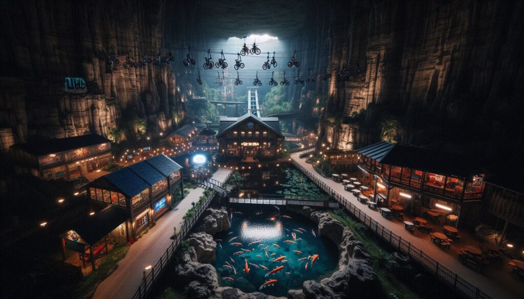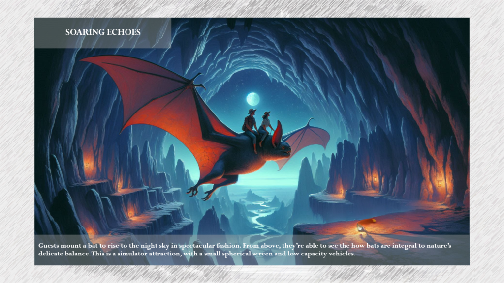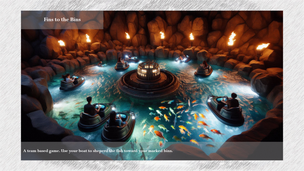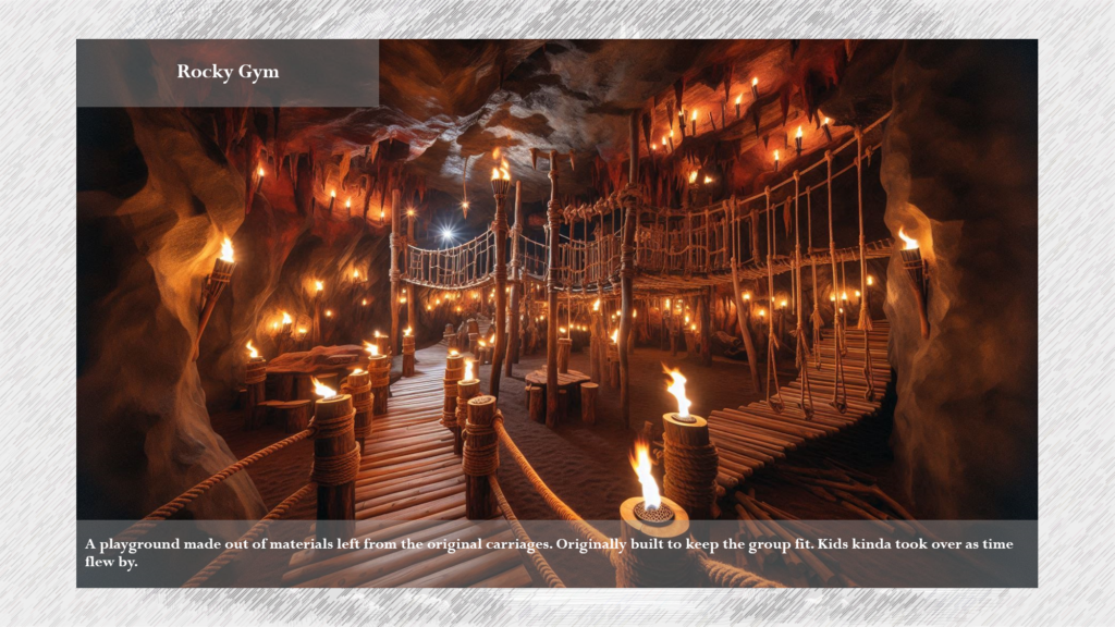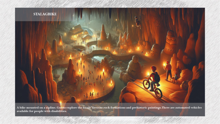 An indoor family entertainment center with three main attractions and other activities. It tells the story of a group of people that were travelling west in mid-19th century. One night, a huge storm fell upon them, for they sought refuge in a cavern. With a false sense of security, they ventured deep within the cavern. The next morning, a kid was trying to light a torch to see their way back to the surface, but a dynamite stick was struck instead, caving the group in with the explosion. Fortunately, the group was resourceful and was able to thrive for almost 200 years! They found ponds with unique bioluminescent fish (food!) and started sustainable farming. They also figured that some hollow rock structures allowed for some crop growth. One of the community members was a French engineer who helped harness the geothermal power of the cavern to transform their carriages into modern marvels. The community had been resilient, finding ways to cope with the close quarters. Some disappeared because they went exploring deeper caves. Some made games out of fish farming. People were restless and found relief in helping set up a “sky-high” wheel circuit, where they would ride a bicycle on a rope, going to the community’s favorite rock formations and prehistoric paintings. A couple people think they have heard a couple of bats talking? Maybe they do need to get out soon… Well, in August of 2024, billionaire Carl S. Menzo bought the land where the cavern is in, opening a way out! Or in? Carl saw the wonders the community built in the two centuries they have been down there, if only there was a way to make money out of it. And here we are! Visit wonderful Carl’s Good Caverns! (no relation to the bad ones)