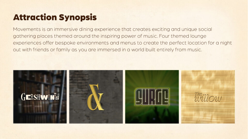 Movements is an immersive dining experience that creates exciting and unique social gathering places themed around the inspiring power of music. Four themed lounge experiences offer bespoke environments and menus to create the perfect location for a night out with friends or family as you are immersed in a world built entirely from music.