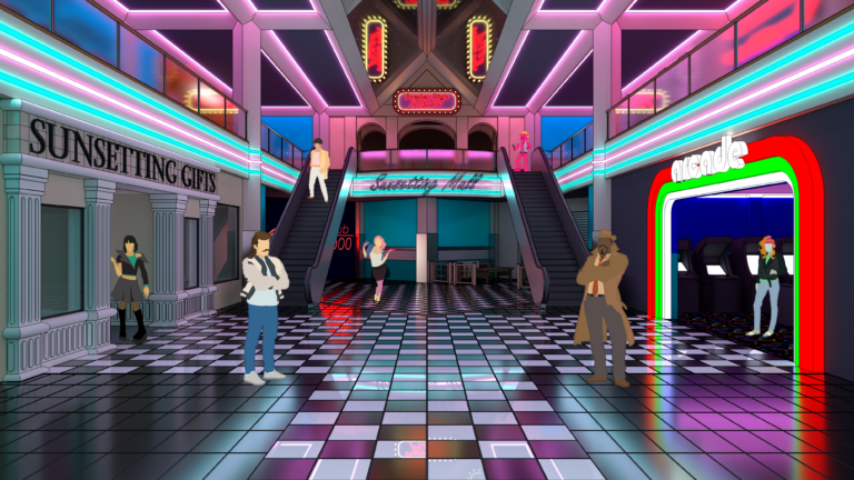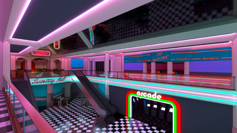 Sunsetting Mall is a new immersive theater attraction that combines nostalgia and interaction to tell an original story set in a fading shopping mall from the 80’s. Through a rich cast of characters and detailed historic environments, guests discover clues and experiences that unveil the mall’s strange occurrences, all stemming from the arrival of supernatural entities in 1989. Among the groups at play in this attraction are the supernatural Dupes with a strange power over their environment, the Theorists and InvestiForce who are digging into the location’s secrets, and The Lost who have had their memories erased as a result of the Dupe arrival. Each character has their own story and motivation which is discovered through guest interaction with actors and the many experiences set within the shops of the mall. After discovering the origins of the Dupes, a way to remedy the memories of the Lost, and how to navigate the Dupe-corrupted environments, the story culminates in uncovering the last of the Dupe’s secrets – their living home and hideaway in the dark recesses of the mall. Inspired by the cultural impact of malls as the work and hangout spots of the past, this adaptive reuse project seeks to revitalize their relevance by introducing a new experience to fill abandoned anchor store locations. Because of Sunsetting Mall’s multiple store and venue layout, adaptation and expansion of the concept to meet site constraints and audience interest are easy. Additionally, the project’s retro approach naturally lends to the reuse of existing space and materials, helping to reduce the environmental impact of the new experience.